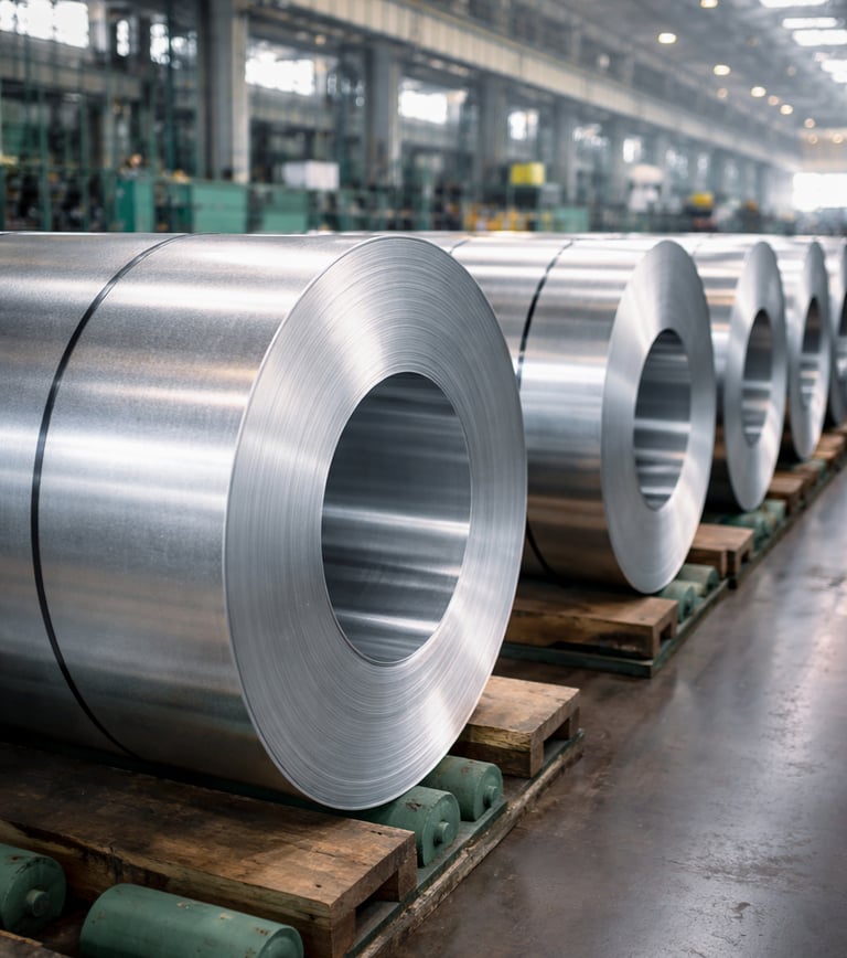 Verzinkte Stahlcoils werden durch ein Feuerverzinkungsverfahren hergestellt, bei dem der Stahl in ein Zinkbad getaucht wird.